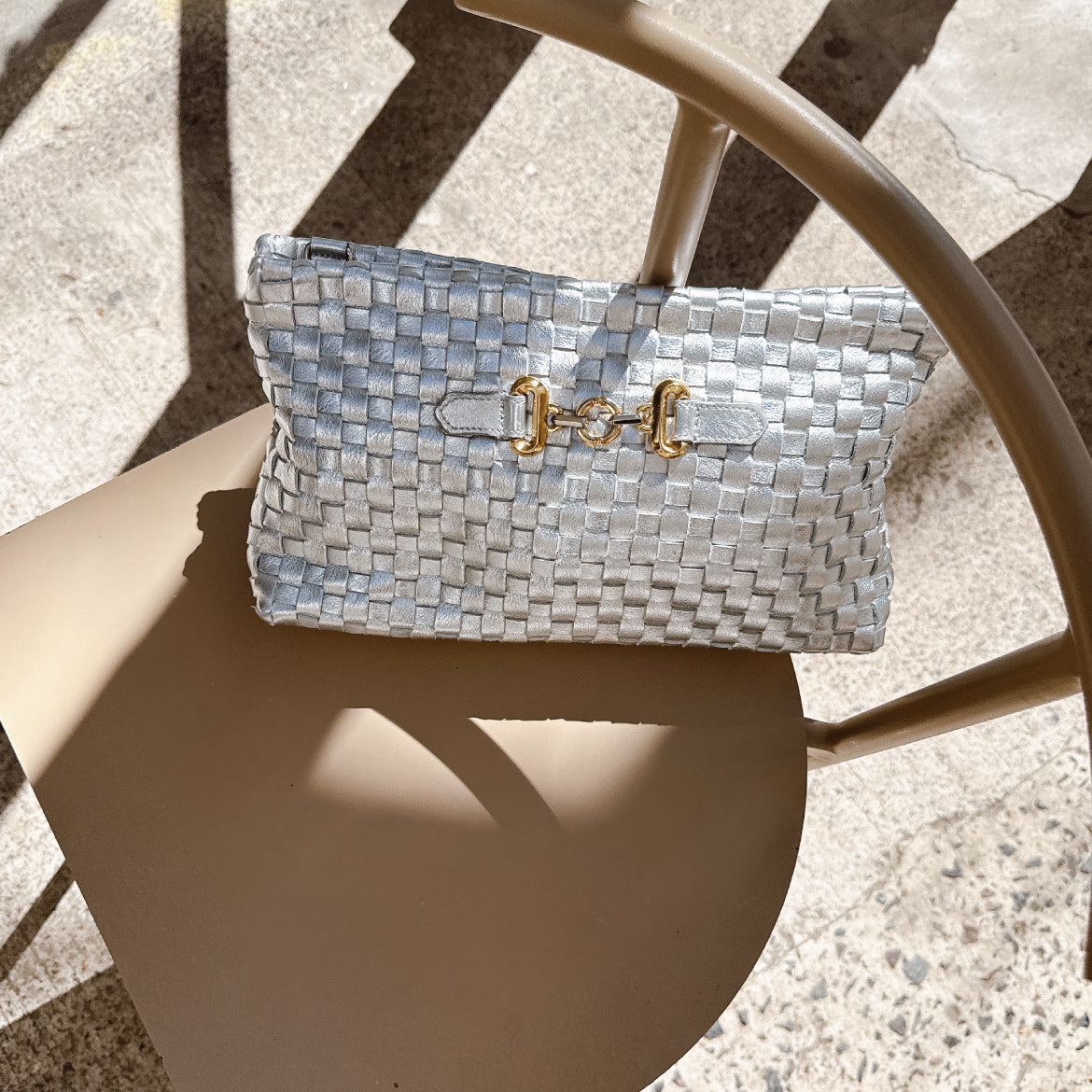MINIBAG DE CUERO TRENZADO CON HERRAJE. DE ESTRUCTURA RECTANGULAR, CON CIERRE Y CORREA FINITA DESMONTABLE. PUEDE USARSE COMO SOBRE DE NOCHE. SU CUERPO TRENZADO ESTA HECHO DE MANERA ARTESANAL. EL ESTRIBO DE LA MARCA OTORGA EL DISTINTIVO A ESTE ARTICULO IDEAL PARA EVENTO O PARA DARLE UN TOQUE ELEGANTE A UN OUTFIT